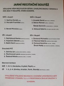 V pondělí 13. 4. 2026 proběhlo ve školní družině vyhlášení výsledků recitace a ocenění umístěných žáků.