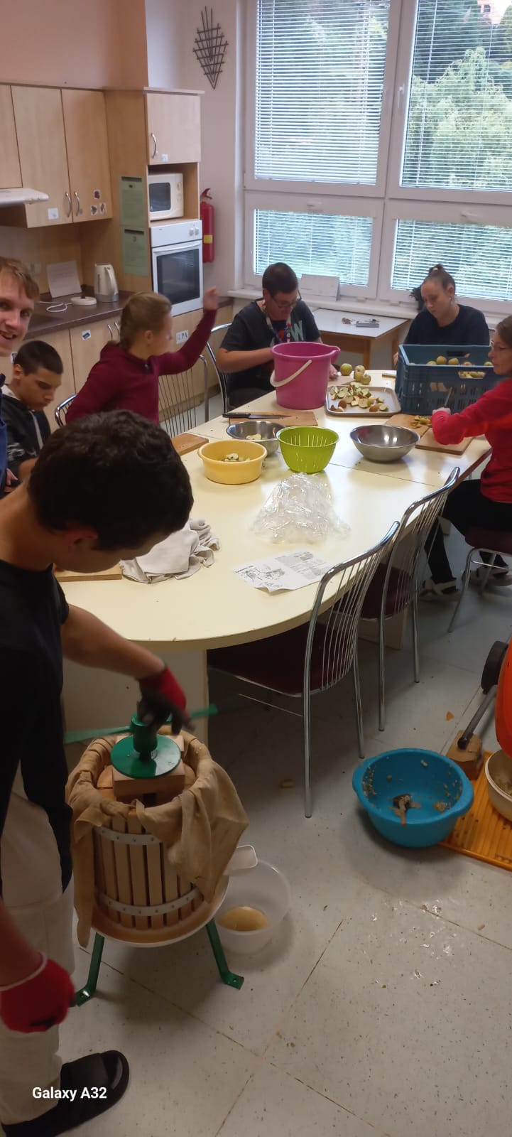 Jablka natrhaná na školní zahradě zpracovali ve školní cvičné kuchyni. Každý přiložil ruku k dílu. A jaký ten jablečný mošt byl? No přece ten nejlepší!